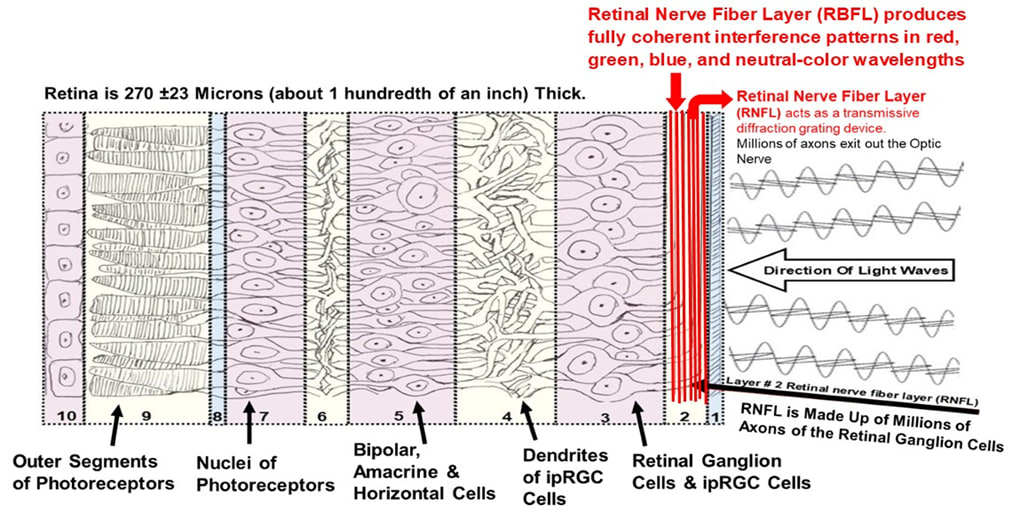 When light waves enter the retinas, they encounter different layers of the retina. The second layer they encounter is the Retinal Nerve Fiber Layer (RNFL) and this layer has axons that are layered perpendicular to the flow of the light waves. The axons are extremely tiny and are packed closely together but are spaced enough to create nanoscale grooves and slits. Because there are millions of axons, there are millions of the nanoscale slits and grooves which act as diffraction gratings. The diffraction gratings facilitate the process of angular dispersion which causes the separation of visible light into its component wavelengths. This is what produces fully coherent light waves.